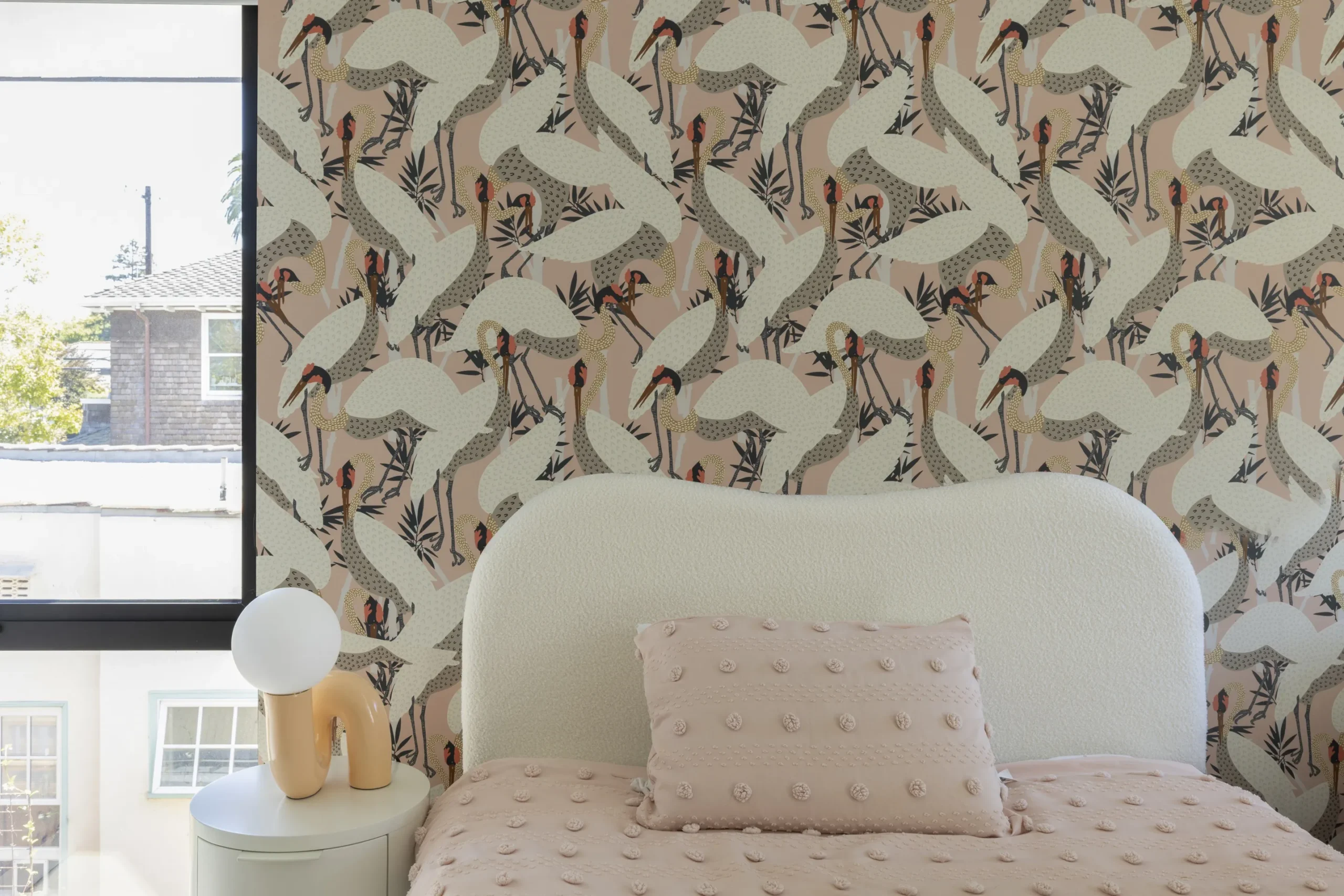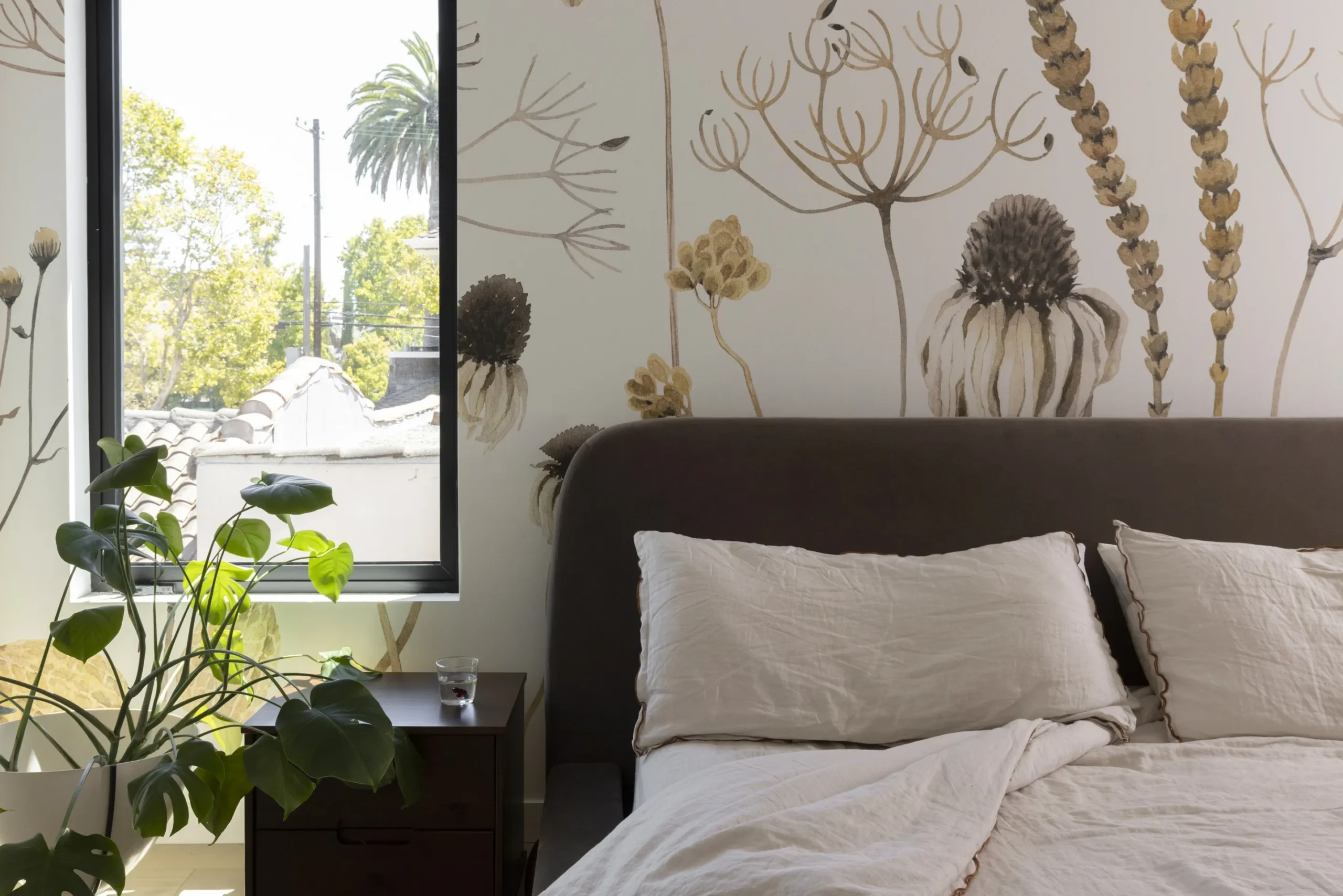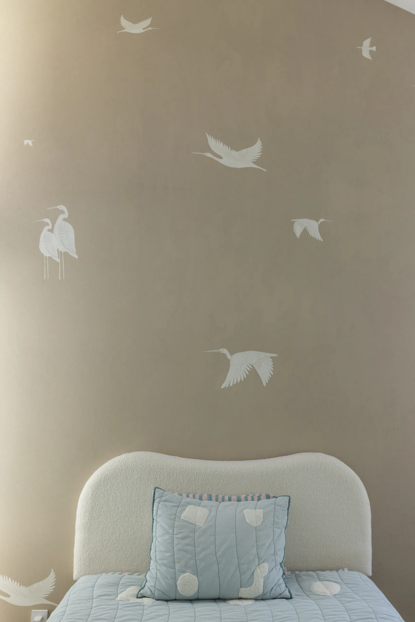 Wallpaper defines each room—botanicals for quiet drama, birds for playful whimsy, and soft silhouettes for a serene, textured backdrop.