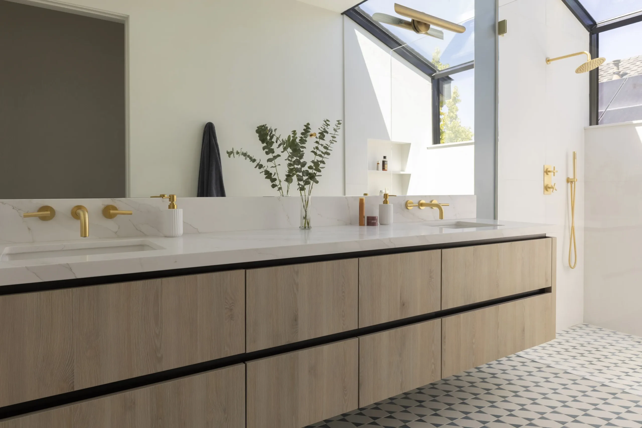 A spa-like retreat with skylit ceilings and patterned tile underfoot. A floating oak vanity with dual sinks is paired with brushed brass fixtures, while glass-framed showers flood the space with natural light and a sense of openness.
