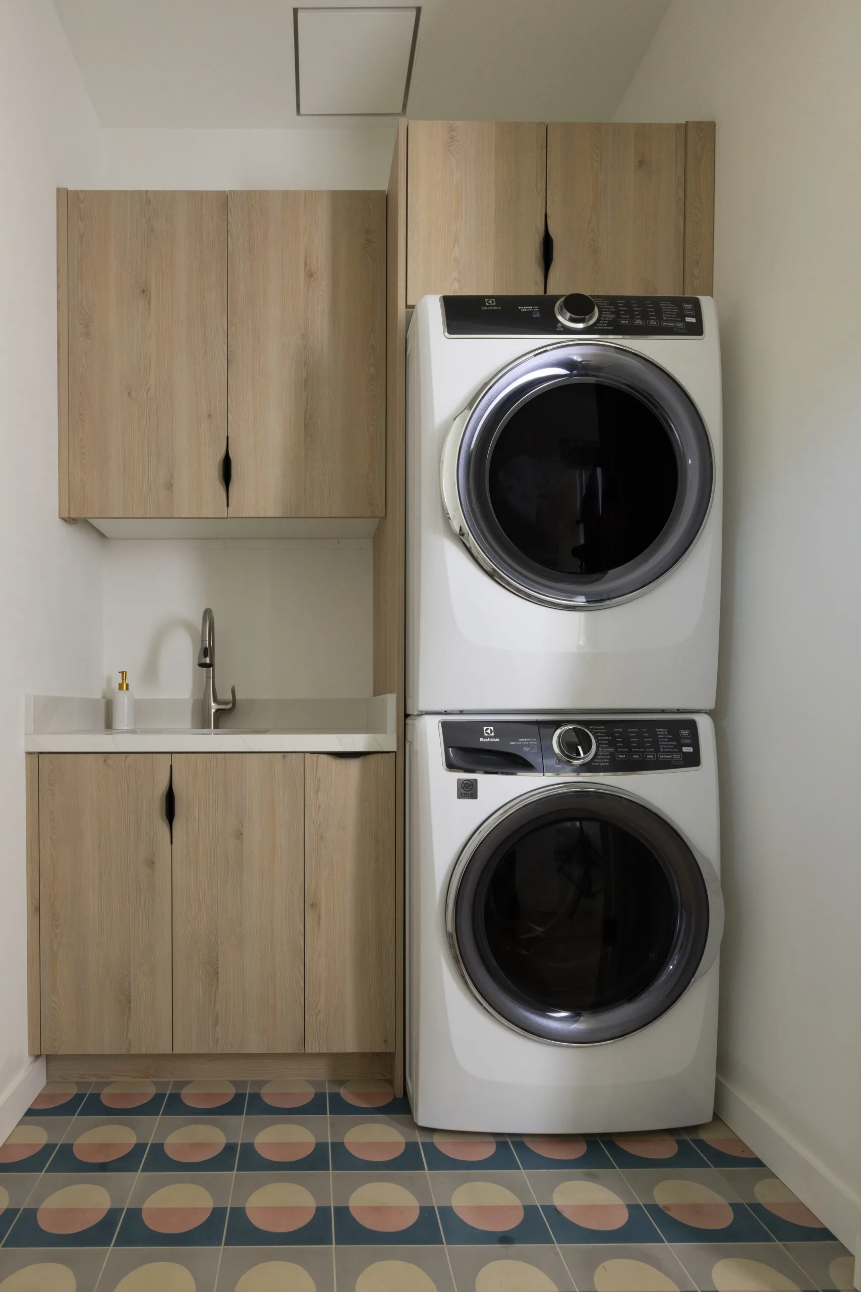 Playful geometric tiles infuse the laundry with color and pattern, elevating the functional space into something cheerful and design-forward.