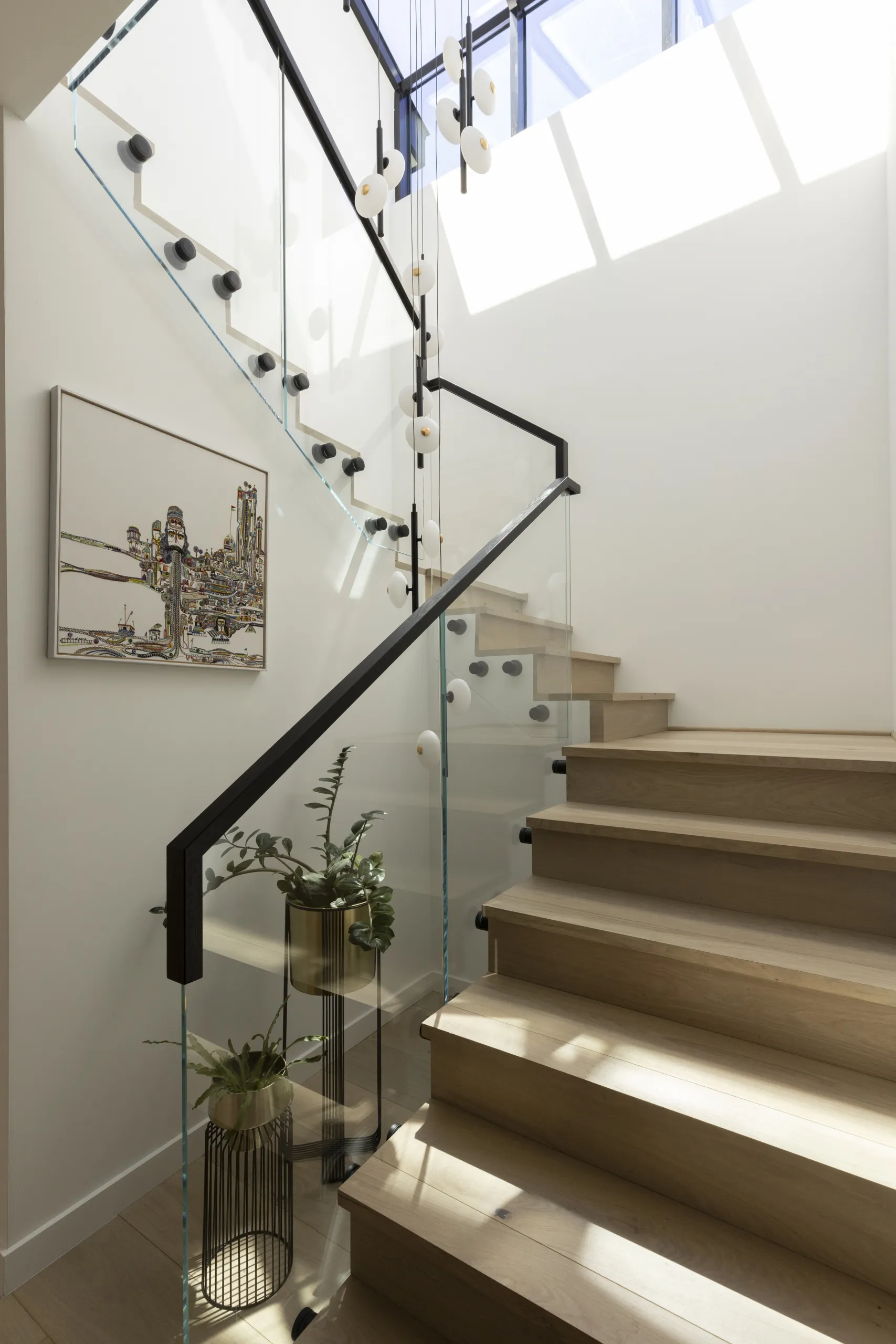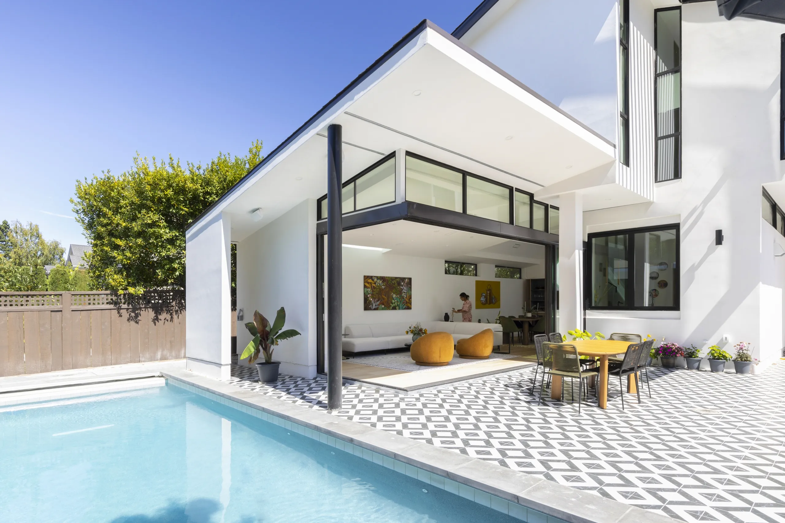 A light-filled living room that blurs the boundaries between interior and exterior. Sculptural orange accent chairs provide visual warmth against the neutral palette, while floor-to-ceiling glass doors frame garden views and invite natural light throughout the day.