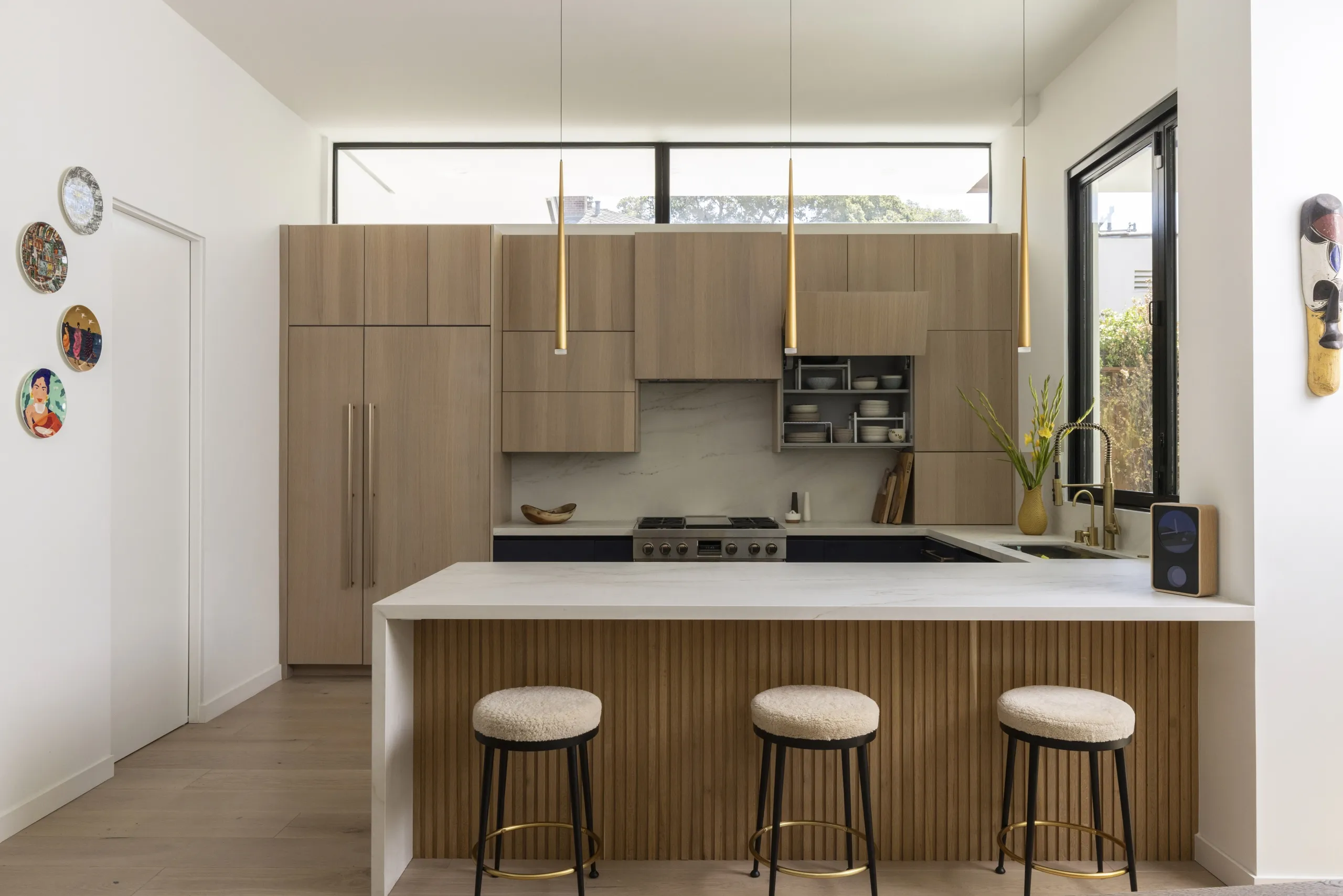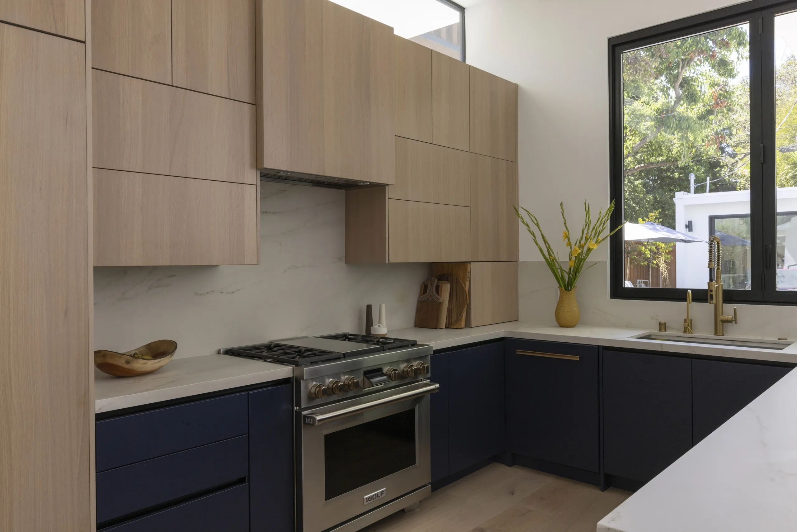 A two-tone palette pairs light oak cabinetry with deep navy lowers, while a fluted island adds texture. Brass fixtures, marble surfaces, and linear pendants bring refined contrast, framed by black-lined windows that draw in garden views.