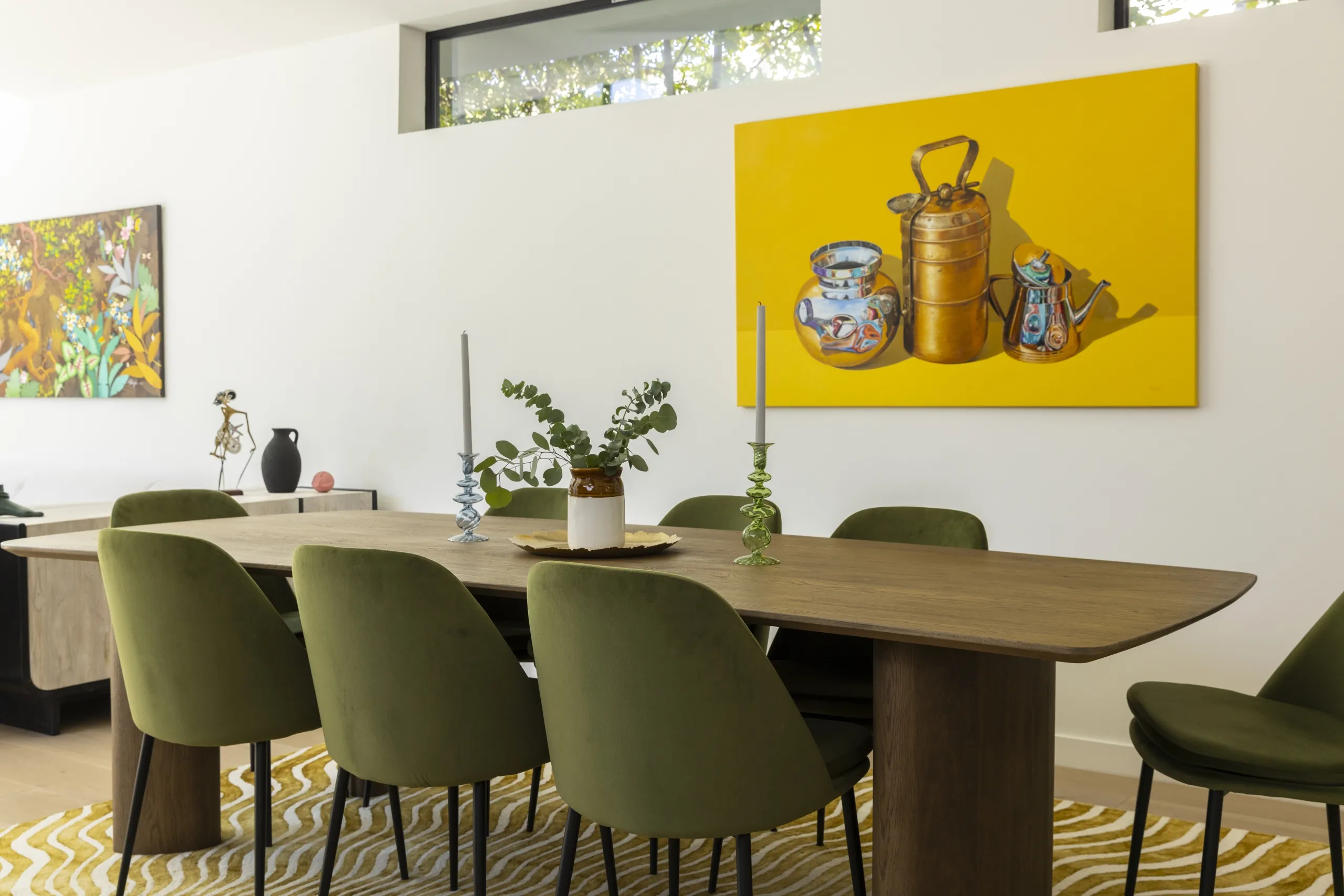 A vibrant dining space anchored by olive-green chairs and bold artwork, with a warm wooden table set for lively gatherings and everyday meals.