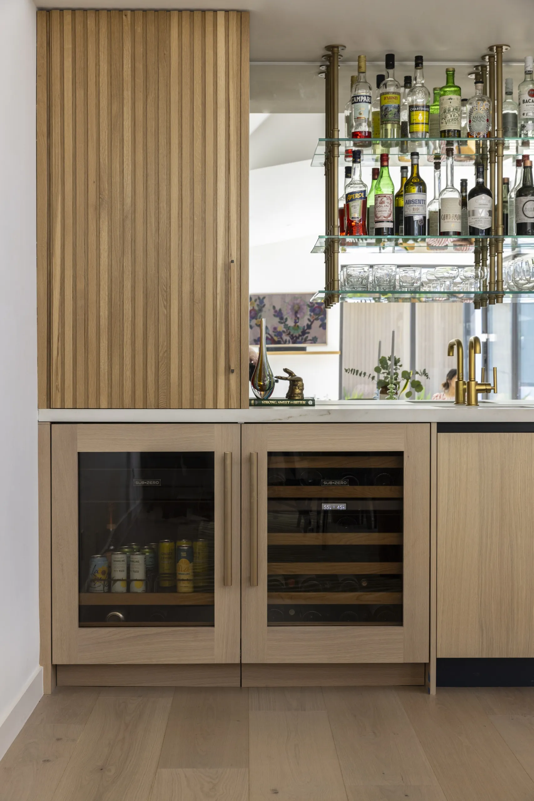 A refined bar nook featuring fluted wood cabinetry, mirrored shelving, and a wine fridge—designed for seamless entertaining day or night